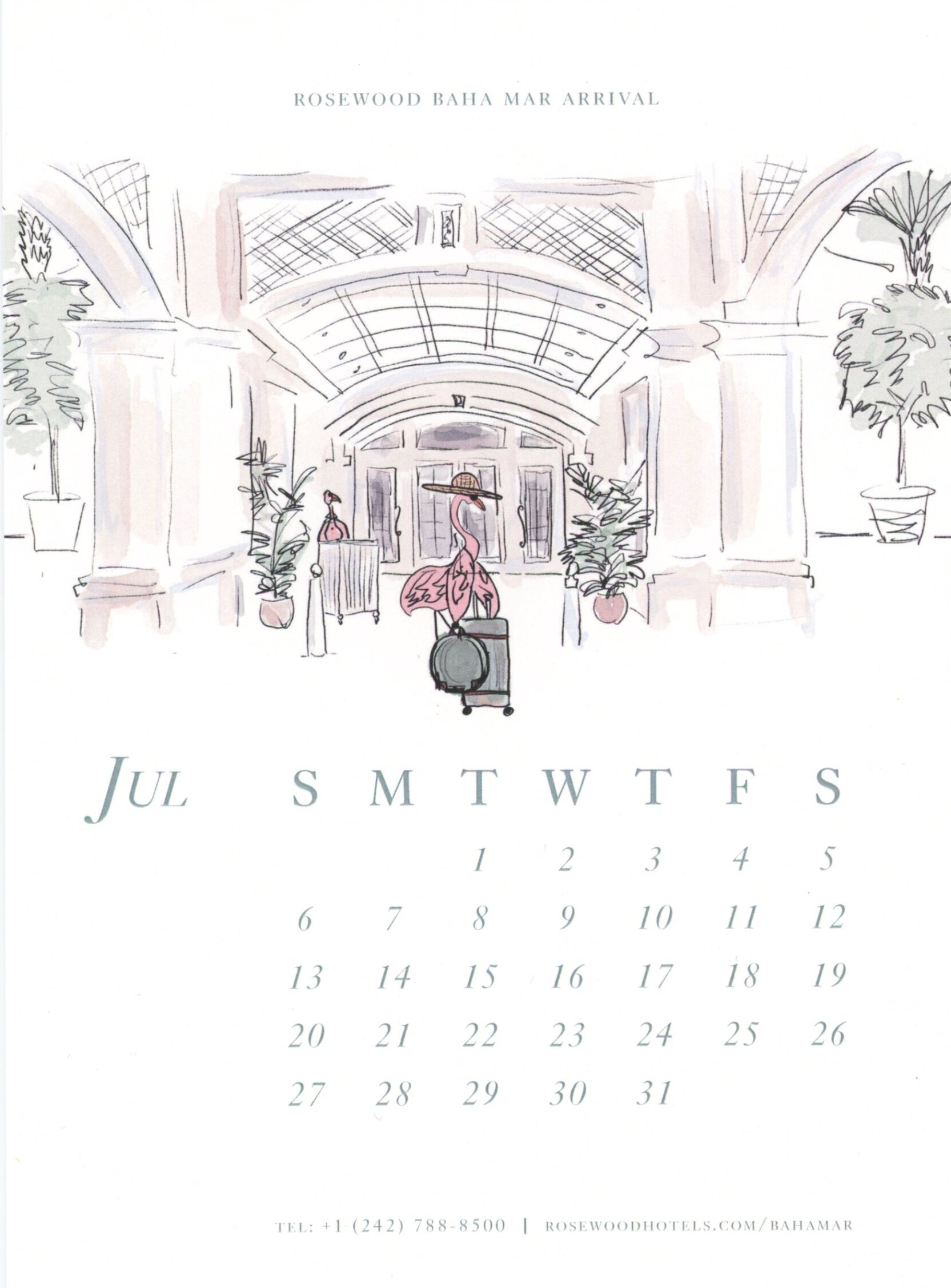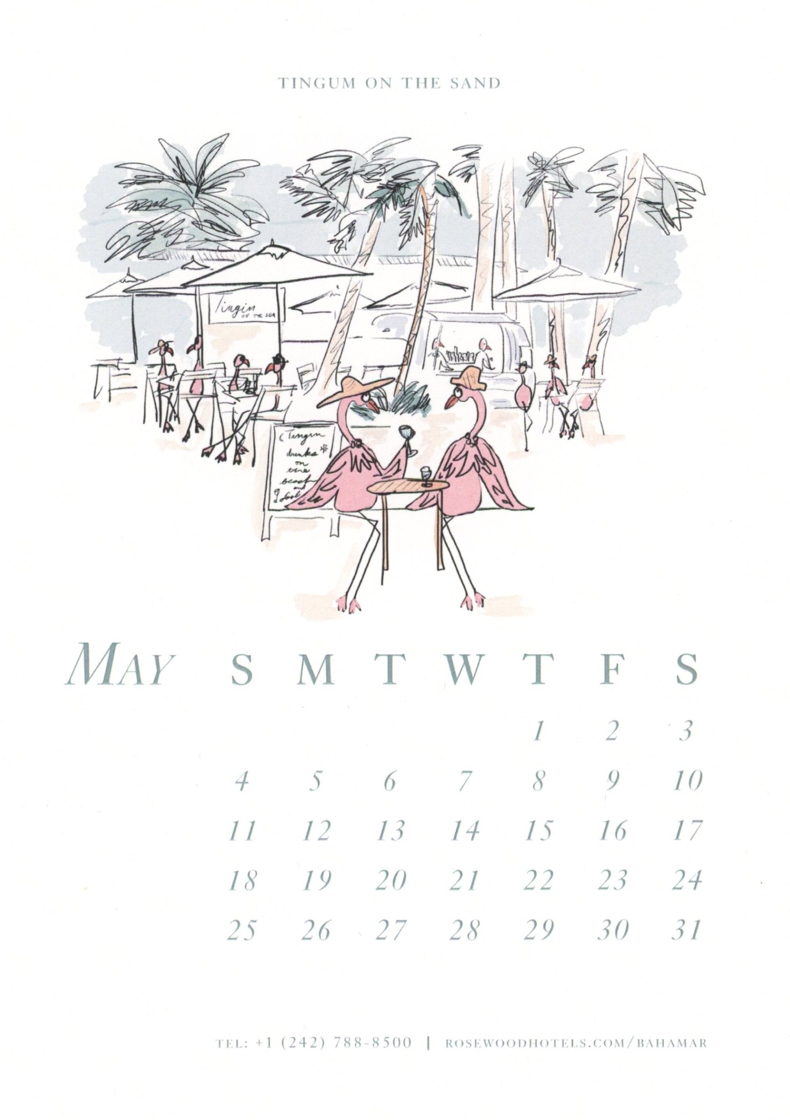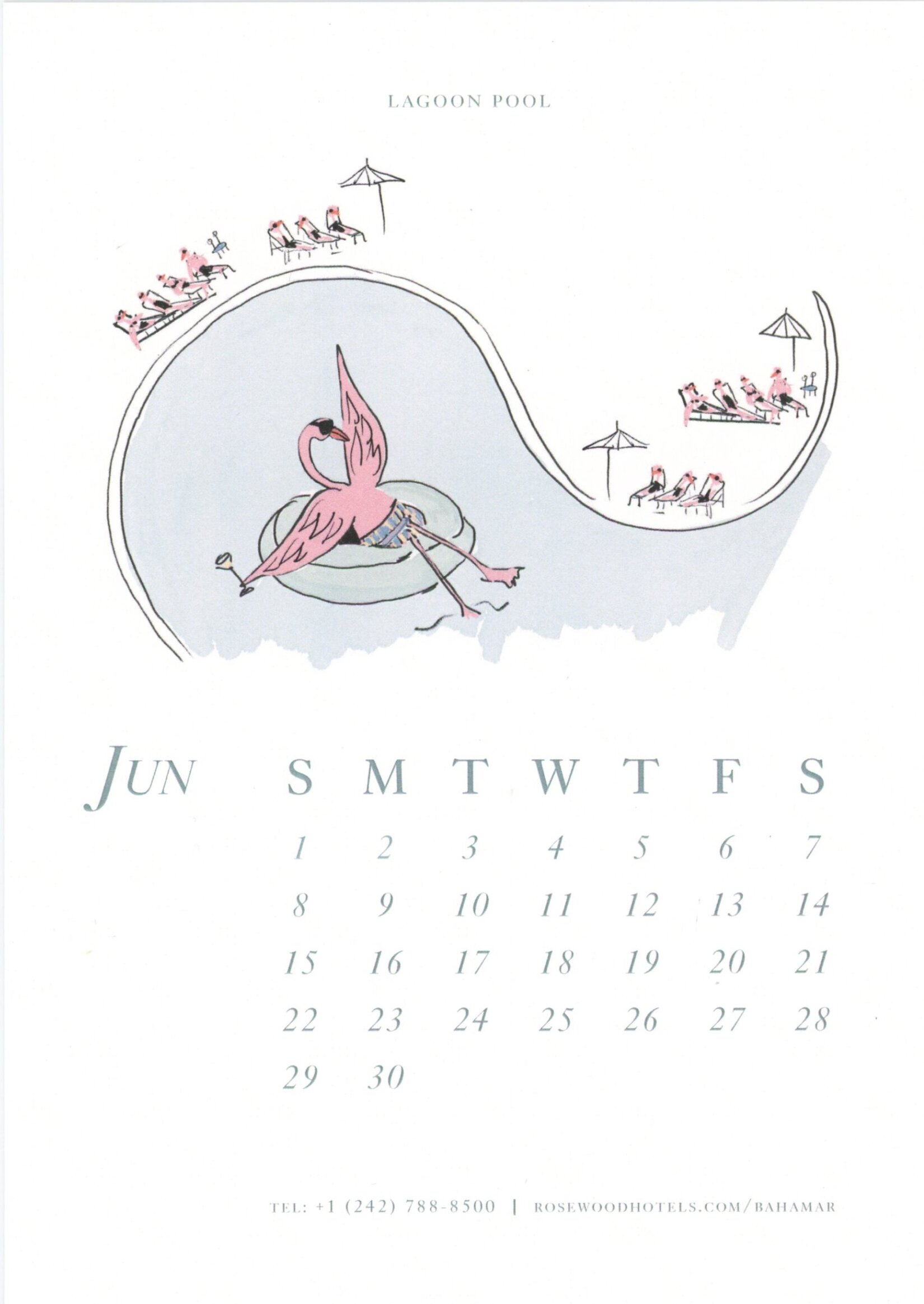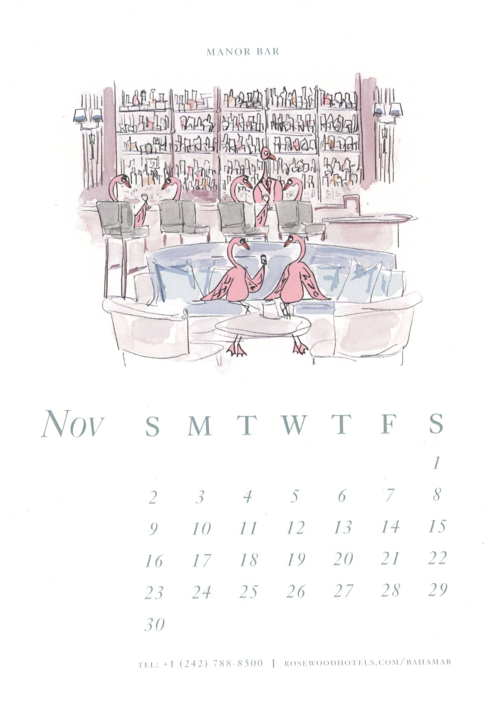 For Carly’s collaboration with Rosewood Baha Mar, Carly created illustrations for an array of the Resort’s Holiday Festive programming including a calendar featuring the hotel’s ambassadors- the flamingos- showcasing all of the activities offered at the hotel.